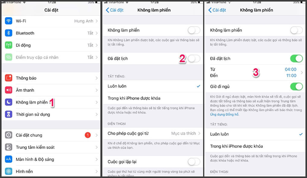 Cách kích hoạt vô cùng đơn giản với: Cài đặt >> Không làm phiền >> Lên lịch thời gian cập nhật thông tin thời tiết và thông báo hiển thị lên màn hình. Theo khung thời gian quy định của anh em, thông thường mình hay lên lịch trong khoản 4:00 đến 11:00 và lên lịch chiều.