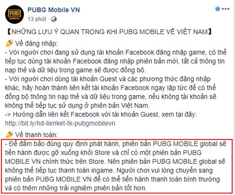 Trên trang chủ chính thức của PUBG Mobile Việt Nam của VNG mới mở vào sáng hôm nay, nhà phát hành đã có một bài viết để giúp game thủ hiểu rõ hơn về quy định khi tham gia tựa game sinh tồn hot nhất hiện nay. Theo bài viết này, PUBG Mobile Việt Nam sử dụng những tài khoản Facebook để sử dụng ở phiên bản này. Những người dùng chơi bằng tài khoản khách hoặc Twitter được khuyên hãy cập nhật tài khoản Facebook vào để có thể lưu những thông tin, dữ liệu như súng ống, trang phục cũng như thứ hạng của mình ở các mùa.